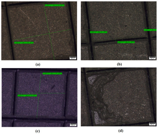The fabricated electrode has been characterized for checking pattern accuracy of Electrode profile using Olympus BX51 optical microscope (OPM) as shown in Figure 8. The smooth edges with 0.5 mm of thickness have been observed in the pattern. The surface morphology and accuracy can alter the performance measures of any system and product. It can be analyzed using OPM [24,25]. However, many scratch marks on substrate could have been observed owing to the handing issues from different stage of development. These marks can be eliminated with careful handling.