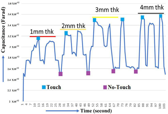 According to the findings of this study, the response parameters included the change in capacitance (C) during touch (pF) in order to measure the change in capacitance. The Keysight U1733C-20000 Counts Handheld LCR Meter with dual Display was used for the same. In the present study, the experimental trials with performance measures were designed in accordance with the design shown in Table 1. In order to improve measurement accuracy, all trials were carried out three times, with the average of the three values being used as the final value. The sensor is going to be mounted to a structural element (IVI Bezel) using an injection molding procedure. The sensor can be mounted at the top or bottom of the IVI bezel, depending on styling requirement. The direct (sensor on top) configuration may result in wear and tear. Hence the sensor on the bottom has been suggested. Its geometry and stylistic requirements determine the thickness of the IVI bezel, which can range from 1.5 mm to 3 mm in most cases. As a result, 1, 2, 3, and 4 mm as the IVI bezel thicknesses for touch sensitivity confirmation been selected as shown in the Figure 11. The Touch sensitivity was measured with Overlap 15 mm/0.5 mm sensor and noticed that the capacitance is increased with respect to thickness increase as shown in the Figure 12.