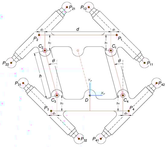 - h—length of the connectors of the articulated quadrangle of the moveable platform (measured between points C1 and C4 and C2 and C3),