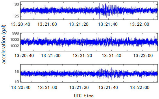 Three-component seismic waveform data recorded by the low-precision MEMS seismic intensity meter. (The event is UTC2017-8-8 13:19:46 Jiuzhaigou M7.0 earthquake in Sichuan, China. The hypocentral depth is 20 km. The monitoring network is 360 km away from the epicenter. The model of MEMS acceleration sensor used is MMA8451Q, and the sampling rate of the seismic sensor is 50 Hz.)