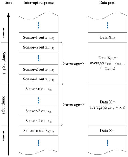 Figure 2 shows a schematic diagram of sensors connected in parallel using the serial peripheral interface (SPI). The master out slave in (MOSI), multiple-input single-output (MISO), and simplified clock (SCLK) for all the sensors are public and connected to the SPI of the microprogrammed control unit (MCU) to reduce the number of pins occupied in the MCU. The interrupt signal line (INT) and chip select line (CS) of each sensor are connected to the I/O port of the MCU so that the MCU can send information to and receive information from each sensor. When an interrupt signal occurs, the MCU responds to each interrupt signal sequentially by recording the real-time data via the SPI and storing the data in a public data buffer pool according to the reading order. After reaching a sampling cycle, the recorded data are collected and averaged (Figure 3).