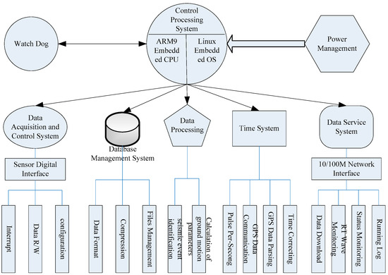 Using a multi-chip, low-cost MEMS digital accelerometer as the seismic sensing unit, a high-performance, low-power 32-bit ARM embedded CPU as the control processor, and Linux as the operating system, we designed a seismic sensor with a low-power data acquisition system. With a built-in large-capacity SD card memory, integrated network communication transmission and control functions, and an embedded real-time seismic data processing algorithm, this instrument is able to automatically calculate ground motion parameters [47]. This small digital microseismograph, which integrates sensors, data acquisition, data storage, and data processing and transmission, consumes less power (less than 2w) and is more affordable (a few hundred USD) to install and maintain than traditional seismometer stations. The seismic sensor is controlled by eight components: the control management module, the data acquisition module, the data storage management module, the data processing function, the GPS time correction function, the data service function, the watchdog function, and the power management function (Figure 4).