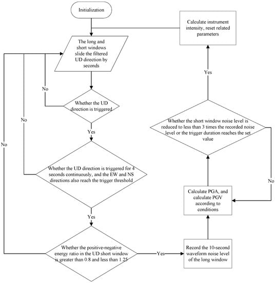 The seismic information processing system filters the real-time data, determines the trigger threshold of the seismic events [48,49,50,51], and calculates the PGA and PGV ground motion parameters. Figure 5 shows a flowchart of the seismic event discrimination and calculations required to determine the ground motion parameters.