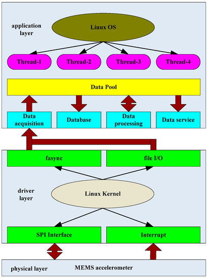The sensor data acquisition module collects the seismic acceleration signals in real time. In order to increase the dynamic range and reduce the cost of the instrument, multiple low-cost MEMS digital accelerometers (ST’s LIS3DHH) were used for parallel acquisition, and the outputs of all sensors were accumulated and averaged to reduce self-noise.