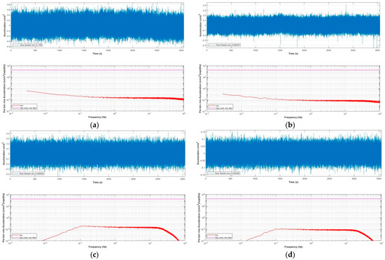 Instrumental noise recording and the spectral density, sampling rate 200 Hz. (a) Unfiltered noise, single sensor acquisition; (b) unfiltered noise, with eight sensors arranged for parallel acquisition; (c) noise with single sensor acquisition, filtered by 0.1–20 Hz bandpass; and (d) noise with eight sensors arranged for parallel acquisition, filtered by 0.1–20 Hz bandpass.