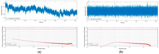 A traditional high-precision force-balance accelerometer was used for comparative testing in the same environment. The BL-03 force-balance accelerometer developed by the Institute of Geophysics, China Earthquake Administration was used, with a measurement range of ±2 g and a sensitivity of 4.75 V/g. The recorded results are shown in Figure 9. Figure 9a shows the original data without filtering, and Figure 9b shows the data with 0.1–20 Hz bandpass filtering by using the same filter mentioned above. As can be seen from the figure, the low-frequency noise of the force-balance accelerometer is relatively high due to the influence of its mechanical structure. However, on the whole, its self-noise is much smaller than that of the MEMS seismic sensor developed in this paper. In the bandwidth range of 0.1–20 Hz, its RMS noise is only 0.00088 cm/s2.