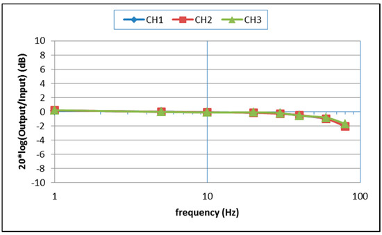 The frequency response and linearity of the seismic sensor were tested at a jolt table. During the test, the three sensing directions of the seismic sensor were made to coincide with the movement direction of the jolt table separately. The jolt table was set to run a variety of sinusoidal test signals with different amplitudes and frequencies; the results of corresponding amplitude–frequency responses and linearity are shown in Table 1 and Table S1 and Figure 10 and Figure 11. To reduce the need for expensive calibration tools such as long stroke linear shaders [52], we only tested the amplitude–frequency characteristics of the instrument at frequencies higher than 1 Hz. It can be seen that after multiple accelerometer output correlation averagings, the amplitude–frequency response of its input and output within −3 dB is DC −80 Hz (Figure 10), and the linearity is better than 0.47% (Figure 11), less than the maximum nonlinearity in the LIS3DHH manual [53].