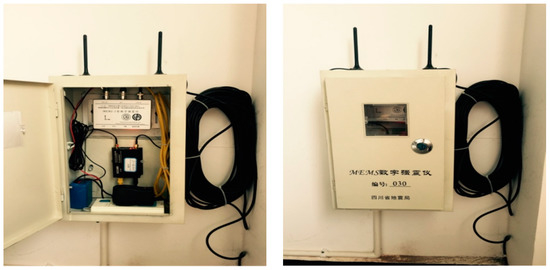 The seismic sensor has been applied in several projects since its development. Figure 12 shows an experimental seismic monitoring network composed of 45 sensors in Sichuan, a province in China where earthquakes occur frequently. The monitoring system consists of the seismic sensor network, the communication network, and the data collection and network monitoring center. To reduce the cost of monitoring, we installed the seismic sensor on the interior wall of the village committee hall, an area with low noise. The instrument was mounted at a height of 0.6 m from ground level; the accessibility of the instrument reduced construction and maintenance costs. The seismic sensor, lithium battery, power adapter/battery charger, power socket, and 3G/4G wireless router were all stored in a small iron electric meter box for protection (Figure 13); the sensor was tightly coupled to the wall and fixed with set screws. Except for the 4G wireless router, which costs a few dozen USD, other materials cost only a few USD. Therefore, excluding labor, the cost of a complete unit is less than USD 1000.