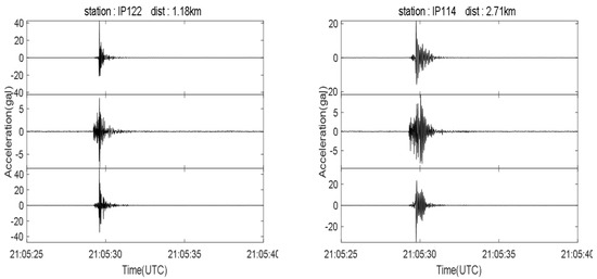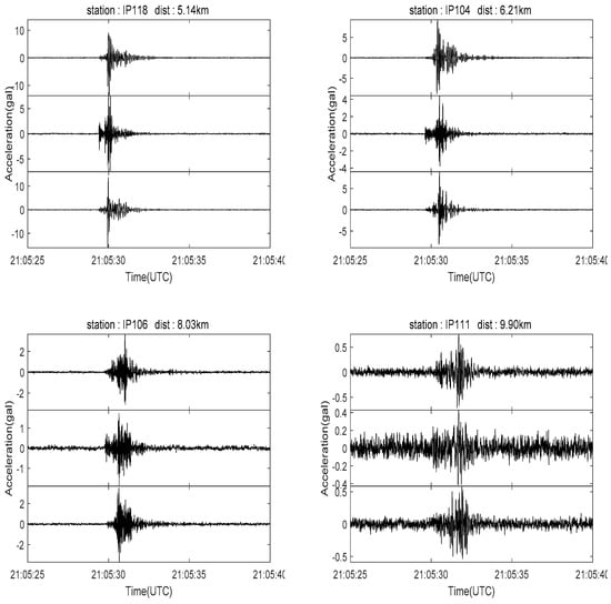Seismogram from a close range M2.2 earthquake that occurred at 21:05:27 (UTC time), 23 July 2020, with a hypocentral depth of 3 km, a sampling rate of 200 Hz, and a bandpass filter of 0.1–20 Hz.