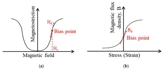 Generally, the magnetostriction behaves nonlinearly based on the magnetic field [37,38], but it has a nearly linear relationship with the dynamic magnetic field in MSTs because the dynamic perturbation is much smaller than the static magnetic bias (Figure 1a). Similarly, a linear approximation can be applied for reception by an MST (Figure 1b). Under the linear model assumption, constitutive equations for a magnetostrictive material are [39,40,41].