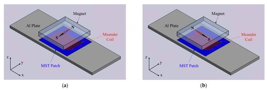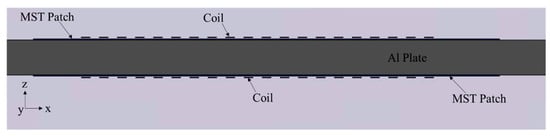 To enhance the SH waves in the plate, a double-sided MST, with the design shown in Figure 10, is investigated. Specifically, it is two separate MSTs perfectly bonded to an Al plate. The current directions in the upper coil and lower coil are properly selected to implement out-of-phase generation for antisymmetric modes and in-phase generation for symmetric modes. Such a design not only enhances the SH wave amplitude but also improves the wave mode control and could be especially powerful for generating higher-order SH guided waves.