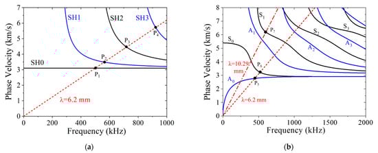 Phase velocity dispersion curves for guided waves in a 6-mm-thick aluminum plate with red activation line: (a) SH waves and (b) Lamb waves. The cross points are P1(500, 3.10), P2(563, 3.48), P3(713, 4.45), P4(922, 5.74), P5(447, 2.78), P6(520, 3.24), and P7(602, 6.19).