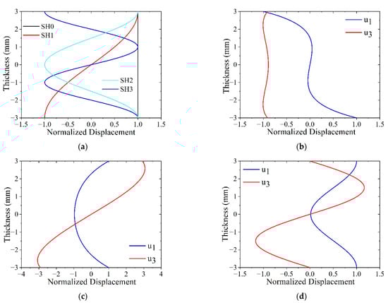 To further demonstrate the difference between guided wave modes and facilitate later modeling results analysis, the wave structures of different modes are calculated and shown in Figure 4. The wave structures for wave modes SH0, SH1, SH2, and SH3 corresponding to P1, P2, P3, and P4 are plotted in Figure 4a. Wave structures of SH modes are sinusoidal functions for the u2 displacement component and are independent of frequency. Lamb wave structures are sinusoidal functions of frequency for the u1 and u3 displacement components [1]. The wave structure for the A0 mode at P5 is plotted in Figure 4b, and the wave structure for the S0 mode at P6 is plotted in Figure 4c, while the wave structure for the S1 mode at P7 is plotted in Figure 4d. The wave structures for Lamb waves were calculated using the semi-analytical finite element (SAFE) method [51].