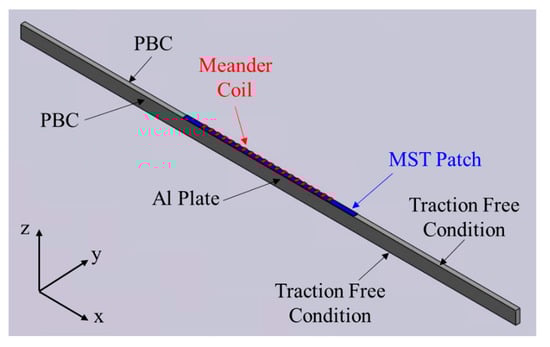 As discussed in Refs. [27,29], MSTs can be modeled using a linear model of the piezomagnetic tensor, and COMSOL Multiphysics software provides such a model for magnetostrictive materials [52]. In the finite element modeling using COMSOL only the meander coil, the magnetostrictive patch, and the waveguide (an aluminum plate in this study) need to be considered. Thus, the MST sketched in Figure 2 can be represented by the 3D COMSOL model shown in Figure 5, which is, in turn, discretized into quadratic tetrahedral elements. The schematic shows that only a thin strip of the MST/waveguide is modeled, with periodic boundary conditions (PBCs) applied to the lateral edges of the plate and the MST patch to ensure that the propagating waves are planar. The model contains only one element through the strip width. The PBCs include both the magnetic field and the displacement field. The top and bottom surfaces of the plate are traction free, and low-reflection boundaries are used at the ends of the model in the x-direction.