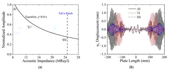 Acoustic impedance mismatch effect. For the normal incidence of waves on an interface, the acoustic impedance is used to assess transmission and reflection. Here we show that acoustic impedance mismatch is not the parameter to consider when assessing energy transfer from the FeCo patch to the plate. In the present case, the waves are actuated in the patch and propagate parallel to the interface. The continuity conditions at the interface require the wave energy to transfer to the plate. This is not a trivial analytical problem to solve and is beyond the scope of the current analysis, but as seen by the finite element analysis of various acoustic impedances, it is necessary to understand the energy transfer problem. We investigate how the acoustic impedance mismatch between the patch and the plate impacts the SH0 mode actuation by replacing the Al plate with Ti and SS. The patch and plate are assumed to be perfectly coupled. The acoustic impedance of the FeCo patch is 24.62 MRayl, while the acoustic impedance values of the Al, Ti, and SS are 8.6, 13.7, and 24.5 MRayl, respectively. The normalized SH0 wave amplitudes for Al, Ti, and SS plates are shown in Figure 6a, which indicates that the SH0 wave amplitude decreases as the acoustic impedance mismatch between the patch and plate decreases. In fact, the relationship between the SH0 wave amplitude and the acoustic impedance of the plate is inverse (). The u2 displacement plotted along the length of the plate in Figure 6b shows the MST actuates waves that propagate in both directions and that there are multiple wave packets present, presumably the SH0 and SH1 modes (which will be analyzed subsequently).