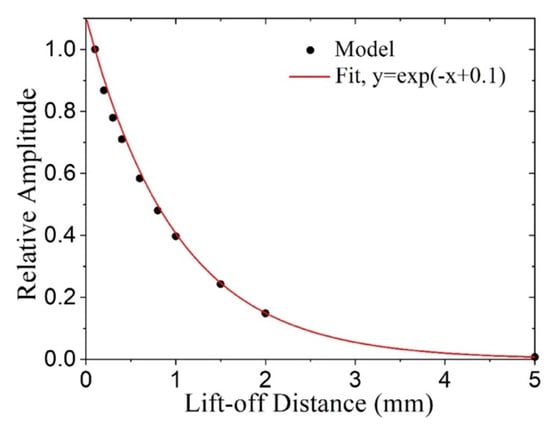 Coil lift-off effect. Lift-off, or an air gap between the coil and the magnetostrictive patch, is considered by varying the lift-off from its minimum value of 0.1 mm to almost 5 mm. Ideally, zero lift-off could be used as the reference, but it is unrealistic in experiments and would cause an issue in the model. Thus, the resulting SH0 amplitudes are normalized with respect to the lift-off of 0.1 mm. Figure 7 shows that the SH0 wave amplitude decays exponentially with lift-off distance, which is similar to Lorenz-force EMATs [22].