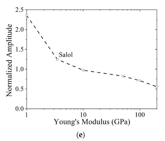 The u2 displacement fields at 50 μs for different adhesive stiffnesses are shown in Figure 8a–d and the relationship between SH0 wave amplitude and Young’s modulus of the adhesive is shown in Figure 8e. In Figure 8e, the SH0 wave amplitudes are normalized by the baseline case and are observed to decrease with adhesive stiffness. In fact, a compliant adhesive increases the SH0 amplitude relative to ideal coupling. Observe from Figure 8a–d that the SH0 wavefield is not uniform through the plate thickness and that the spatial width of the wave packets increases from Figure 8a,d, even though the peak amplitude decreases. Finally, ringing underneath the MST patch takes place, and the most ringing occurs when Young’s modulus E = 10 GPa.