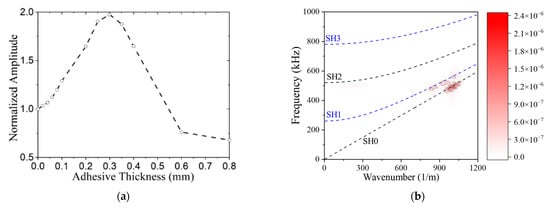 Adhesive layer thickness effect. In addition to the material properties of the adhesive affecting the MST response, its thickness will too. Adhesive thicknesses from 0 to 0.8 mm are considered, given the properties for salol. The influence of the adhesive layer thickness on the SH0 wave amplitude is shown in Figure 9a. As the adhesive thickness increases the amplitude first increases, reaches a peak, and then decreases. We found it surprising that the wave amplitude increased for adhesive thicknesses from 0–0.3 mm as traditional thinking holds that thin bond lines work best. Thus, we investigated the modal distribution by performing a 2D fast Fourier transform (FFT) and plotting the wavenumber spectrum on top of the dispersion curves for adhesive thicknesses of 0, 0.3, and 0.6 mm in Figure 9b–d. In each case, SH0 is the predominant mode, but the SH1 mode also propagates. Although there are higher intensities for the 0.3-mm-thick adhesive, the relative distribution between SH0 and SH1 appears to be roughly the same. Future work should investigate why the presence of a relatively compliant (E = 3.49 GPa) adhesive between the stiff plate (E = 70 GPa) and patch (E = 180 GPa) increases the amplitude of the actuated SH0 waves.