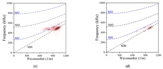 The ability of double-sided MSTs to provide excellent mode control is further illustrated for the symmetric SH2 mode at 719 kHz (actuation point P3 with the wave structure shown in Figure 4a) in Figure 11c and Figure 12c. Likewise, double-sided excitation of the antisymmetric SH3 mode at 922 kHz (actuation point P4 with the wave structure shown in Figure 4a) is shown in Figure 11d and Figure 12d. In summary, the double-sided MST provided excellent mode control up to 922 kHz, which is an fd product of 5.5 MHz-mm. We did not investigate the upper limit of this capability. Giving the double-sided MST the same current at different frequencies led to the peak u2 displacement amplitudes of 2.0, 2.9, 1.4, and 0.8 nm for frequencies of 500 kHz (SH0), 563 kHz (SH1), 713 kHz (SH2), and 922 kHz (SH3), respectively. The amplitude increased from SH0 to SH1 and decreased thereafter for SH2 and SH3.