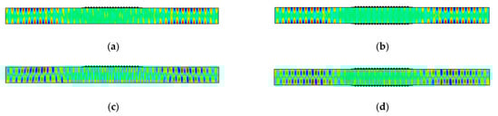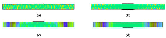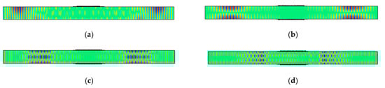 Finally, models for the single-sided MST and the double-sided MST with a 10.29 mm wavelength meander coil and a 602 kHz excitation signal (actuation point P7) are solved to demonstrate the MST excitability of S1 Lamb waves. The u1 and u3 displacement fields at 40 μs for the single-sided MST and the double-sided MST are given in Figure 15. The wave structures for both MSTs in Figure 15 are consistent with the S1 wave structure in Figure 4d, which indicates that MSTs are capable of generating S1 mode although the u3 displacements on the top and bottom surfaces of the plate are zero. The displacement distribution patterns of u1 and u3 for the single-sided MST are similar to these on the double-sided MST except that the antisymmetric u3 pattern in Figure 15c is not as obvious as its counterpart in Figure 15d. The amplitudes of the displacements for both cases are listed in Table 3. The amplitude of the u1 displacement from the double-sided MST is roughly 1.5 times that from the single-sided MST. Although the amplitudes of the u3 displacement for both cases are not zero on the surface (as in the wave structure), they are comparable to the noise level in the waveguide, e.g., the ringing underneath the MST patch.