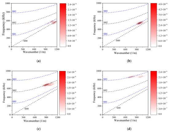 To demonstrate the capability of a double-sided MST for preferential mode actuation, model results for the antisymmetric SH1 mode (u2 displacement) using a double-sided MST with out-of-phase excitation at 563 kHz (actuation point P2) is shown in Figure 11b, while its counterpart for a single-sided MST with the same excitation signal is shown in Figure 11a. The SH1 wave structure (illustrated in Figure 4a) is antisymmetric for u2, meaning that u2 has equal magnitudes but opposite signs at equidistant points from the midplane. The double-sided MST provides an antisymmetric u2 displacement field, while the single-sided MST does not. The 2D FFT can be used to assess the modal content of the u2 displacement fields. 2D FFTs obtained from u2 data acquired along the bottom surface of the plate for single-sided (Figure 11a) and double-sided (Figure 11b) MST actuation are shown in Figure 12a,b, respectively. The dispersion curves for SH waves are superimposed on the wavenumber spectra to enable modal identification. The intensity range in Figure 11b is twice as large as the intensity range in Figure 11a and the u2 amplitude comparison for the SH1 mode is given in Table 3. More importantly, the double-sided MST predominantly excites the SH1 mode, while the single-sided MST appears to excite more of the SH0 mode than the SH1 mode. Thus, in addition to providing double the wave energy, the double-sided MST provides much improved control over which mode is generated.