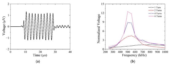 Reception bandwidth of SH wave MSTs with different numbers of coils: (a) A-scan signal showing the received signal for 500 kHz and a 1-turn coil (reference case); (b) normalized amplitudes of SH0 waves at different frequencies received by different coils.