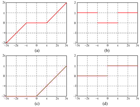 (a) Soft thresholding function, (b) derivative of the soft thresholding function, (c) ReLU function, and (d) derivative of the ReLU function.