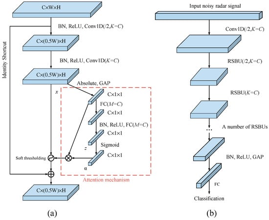With the development of radar technology, the electromagnetic environment is becoming increasingly complex, and received radar signals are inevitably accompanied by noise [,]. What is more tricky is that different types of noise have different impacts on radar signals. Traditional signal analysis and processing methods are effective only for a certain type of noise. Besides, the recognition accuracy is low under strong noise conditions. For deep learning methods, the learned high-level features are likely to be less discriminative under the interference of noise. Therefore, it is necessary to develop a new radar emitter signal recognition model that not only has the ability to process different types of noise, but can also achieve a high recognition rate under strong noise conditions. To achieve the above requirements, in this study, a radar emitter signal recognition method based on a 1D deep residual shrinkage network (DRSN) is proposed.