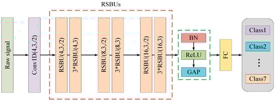 The structure of the proposed network is shown in Figure 4. The first and second numbers in the bracket in residual shrinkage building units (RSBUs) are the number and width of the convolutional kernel, respectively. “/2” represents a step length of 2. In the RSBUs, three RSBUs were followed when the previous DRSN’s step length was 2, and there were a total of 12 RSBUs. The number of iterations was 160. To accelerate the training speed while ensuring the training accuracy, the original learning rate was set to 0.1. The learning rate decreased by 10-fold every 40 cycles until the number of iterations was 120, lastly, the learning rate of the final 40 cycles decreased by 2-fold. The number of batch samples was set to 128. To prevent overfitting of the model, we used L2 regularization, and the penalty coefficient was set to 0.0001 according to the recommendations of [].
