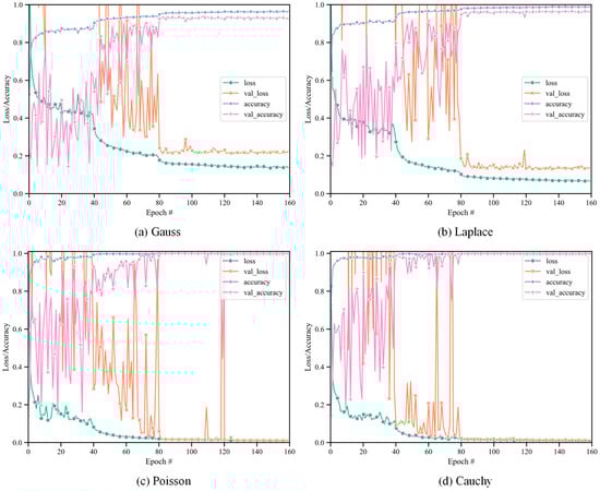 As Figure 5 shows, the accuracy of the training set and validation set of the four types of noise reaches a high level as the number of iterations increases, and then they were both stable after 120 iterations, indicating that the model has converged, and finally the training accuracy nearly stabilized at 96.51%, 99.00%, 99.90%, and 99.99%, respectively.