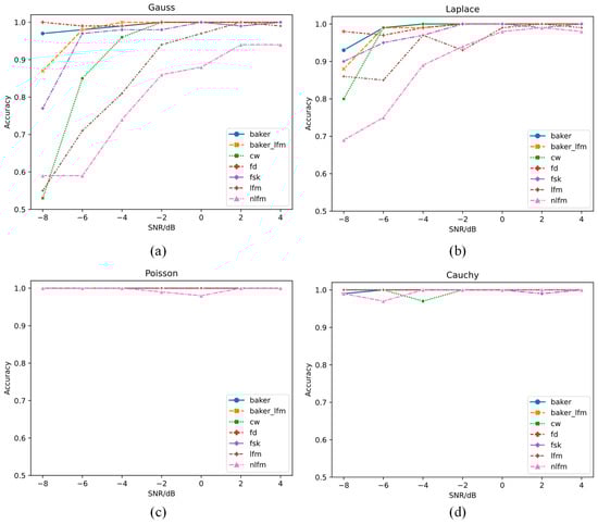 As Figure 7a,b show that, except for some of the LFM and NLFM signals being aliased, the most samples of the same type of radar emitter signal are concentrated in the same area and away from other types of samples, indicating that the features learned by the 1D DRSN have high discrimination ability. Some LFM and NLFM samples are aliased, the reason why is that the only difference in terms of amplitude is that the changing rate in the time domain. Against the noisy background, the Gaussian noise or Laplacian noise covers this unique distinguishing feature, thereby causing aliasing of LFM and NLFM samples. This also explains why the recognition rate of LFM and NLFM signals is low when the SNR is low. If the LFM and NLFM signals are regarded as frequency modulation signals, the recognition rate would be improved. In addition, Figure 7c,d show that the distance between different types of samples is large and that the same types of samples are concentrated in the same areas, indicating the high discrimination of the learned features. As Poisson noise and Cauchy noise appear as a sudden spike in the time domain, it does not affect the signal waveform, the DRSN filters out the noise well and is able to retain useful features, resulting in high signal recognition rate.