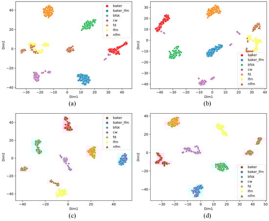 We analyzed the features learned by the 1D DRSN model. Specifically, the test samples were input into the trained 1D DRSN model to extract the features after the global average pooling layer, and the t-distributed stochastic neighbor embedding (t-SNE) was used to reduce the dimensionality to two-dimensional space for visual analysis []. Although there was information loss during the dimensionality reduction process, t-SNE, as a nonlinear unsupervised dimensionality reduction method, can intuitively determine whether the learned features are distinguishable. Figure 7 shows the two-dimensional t-distribution diagrams of the radar emitter signals at 4 dB under four types of noise.
