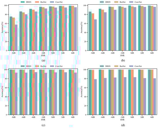 Figure 6a shows that under Gaussian noise, when the SNR is above −2 dB, the recognition rate reaches over 86%. Note that, except for linear frequency modulated (LFM) and nonlinear frequency modulated (NLFM) signals, the recognition rate of all signals is above 85% when the SNR is over −6 dB. The reason for the low recognition rate of LFM and NLFM signals with low SNR is that both LFM and NLFM signals are frequency modulated signals, the raw time-domain waveforms of which are very similar, and the difference in the frequency domain cannot reflected. Moreover, under the condition of strong Gaussian noise, the features of the two signals are covered, which increases the difficulty of recognition. However, the recognition accuracy of LFM and NLFM achieve 99% and 94%, respectively, when SNR is 4 dB shows that 1D DRSN is still better than the general deep learning methods. If only the frequency modulation signal needs to be recognized, the recognition rate would be improved. Under Laplacian noise, when the SNR is greater than −8 dB, the recognition rate of the 7 types of radar emitter signals is greater than 69%. Figure 6a,b show that the overall recognition rate of radar emitter signals with Laplacian noise is higher than that of the signals with Gaussian noise, indicating that the 1D DRSN model has stronger adaptability for signal recognition under non-Gaussian noise conditions. Under the condition of Poisson noise and Cauchy noise, the average recognition rate is greater than 98%, 97%, respectively, as shown in Figure 6c,d. This is because Poisson noise and Cauchy noise appear as a spike in the time-domain signal. Compared with the signal amplitude, the Poisson noise and Cauchy noise amplitude are much larger. Unlike the situation of the first two types of noise, where the time-domain waveform is submerged by the noise, the time-domain waveform is basically retained under the background of Poisson noise and Cauchy noise. Thus, the 1D DRSN model can accurately filter out the Poisson noise and Cauchy noise, and the learned features have strong discriminative ability, leading to a high average recognition rate. The recognition rate under each condition is described in detail in the Appendix A.