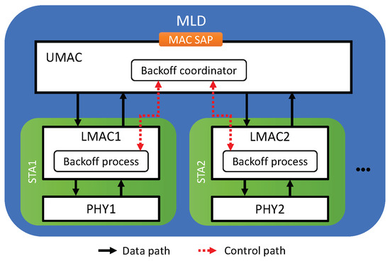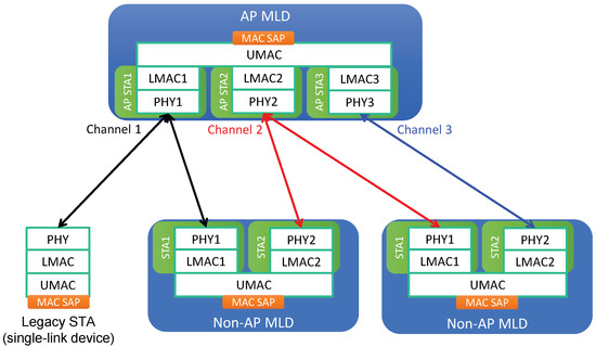 Each affiliated STA of an MLD is composed of PHY and LMAC components. On top of the set of affiliated STAs, an MLD has one UMAC component to aggregate its set of affiliated STAs and provide LLC with a single MAC SAP. An AP STA and any non-AP STAs associated with it form a basic service set (BSS). As illustrated in Figure 1, an AP MLD can manage non-AP MLDs through the establishment of different links. A non-AP MLD can be linked to multiple non-AP STAs using individual channels, each of which is associated with an AP STA of the AP MLD.