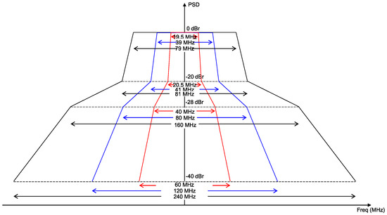 Since multiple radio interfaces exist within a single MLD, near-band in-device interference may arise. Figure 3 shows the transmit spectral mask requirements of an IEEE 802.11 transmitter in the 20, 40, and 80 MHz bandwidths [18]. As shown in this figure, for a transmit power of 1 mW, the maximum allowable power leakage to other channels ranges from −20 dBm (for neighboring channels) to −40 dBm (for other channels); for a typical level of transmit power (e.g., 20 dBm), this range will be higher. These RF power leakage levels are higher than the energy detection (ED) threshold of IEEE 802.11, which is −62 dBm. This may cause other links that are contending in other channels to falsely detect such leakage as a busy medium.