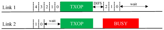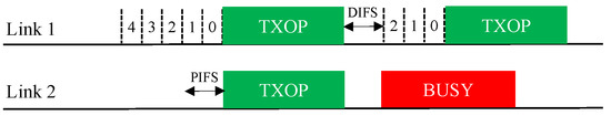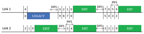- Sync-PL: This scheme resembles the conventional wideband operation of IEEE 802.11 [6,18], as illustrated in Figure 6. In this operation scheme, an MLD runs a single BO in a primary link (PL) only. When the backoff count of the primary link is about to reach zero (within one point coordination function interframe space (PIFS) before the backoff completion time), the MLD performs a short CCA for a PIFS on each of the other links to check the availability of each. At the time of backoff completion, the MLD transmits frames using the primary link and the other link(s) sensed to be idle such that the transmissions on the used links will finish at the same time. If no other link is available at this time, the MLD uses the primary link only. In this manner, the transmit opportunities (TXOPs) of different links are synchronized with each other.