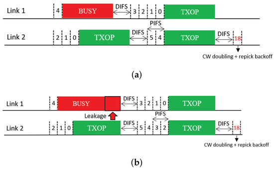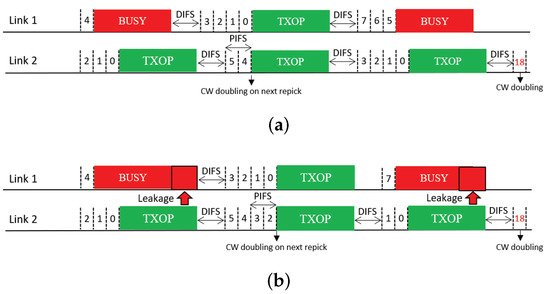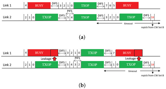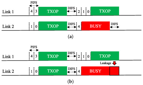 There have been some research attempts toward multi-link aggregation in the unlicensed spectrum. Glia [10] is a software implementation combining orthogonal frequency channels of multiple center frequency bandwidths and can achieve a high data rate through semisynchronous channel access. E-MICE [11] exploits multiple Wi-Fi radio links in individual bands concurrently with the aid of either link-layer aggregation or the Multipath Transmission Control Protocol (MPTCP). It is equipped with an algorithm to dynamically turn on/off links and switch between them to minimize energy consumption with little performance degradation. Naribole et al. [12] have developed a constraint-aware aligned downlink ending protocol for simultaneous downlink transmissions over multiple channels for devices with no ability to simultaneously transmit and receive. Listen-before-talk schemes (LBT) for multicarrier aggregation of Long-Term Evolution with License-Assisted Access (LTE-LAA; LTE for unlicensed spectrum) [13,14] have been studied, and enhanced schemes for use in the presence of RF power leakage were proposed in [15,16,17]. As proposed by the above-mentioned works, multi-link operation requires a new channel access scheme to better exploit multi-link transmission opportunities. However, none of these prior research works focused on the issue of coexistence with legacy single-link Wi-Fi devices for multi-link channel access schemes. Exploring the coexistence problem and designing solutions within the framework of EHT will be essential to facilitate the wide and fast penetration of the new approach.