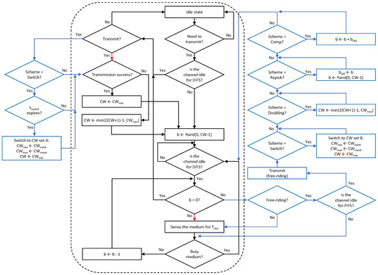 In what follows, we describe the details of the proposed solutions. The approach of the proposed solutions is to assign a free-riding link a penalty for its subsequent channel access following a free-ride transmission so that each link of an MLD will experience a similar amount of backoff time as a legacy device does in the same channel. We propose four features for assigning penalties to free-riding links. Then, various combinations of these features are considered as solutions, as listed in Table 1. The proposed architecture of an MLD is depicted in Figure 9 where the proposed solutions are implemented by the interaction between the backoff processes of individual links through the backoff coordinator of the UMAC. The entire procedure for channel access by a link is illustrated in Figure 10 and its pseudocode is given in Algorithm 1, where a new flag variable named Scheme indicates the features to be activated.
