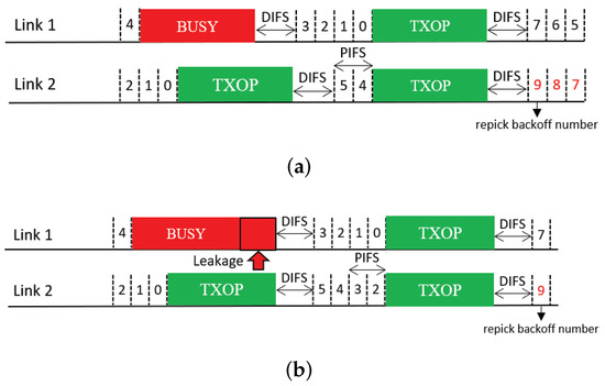 The last feature compensates the backoff count of a free-riding link by a certain amount such that it will ultimately go through the full backoff time length on average. The operation of the solution that utilizes this feature is illustrated in Figure 15. This feature requires an STA to repick a new backoff count value to be added to the current count. Thus, we refer to the solution that includes this feature as Repick + Comp. In the example shown in the figure, the MLD repicks a backoff count value of eight (STR case) or ten (non-STR case) for Link 2 (free-riding link). After the free-riding transmission finishes, the link stores its current backoff count value as and repicks a new backoff count b. Then, it performs a new BO with an initial count of . In this example, the backoff count of Link 2 becomes eleven after compensation instead of three (STR case) or one (non-STR case).