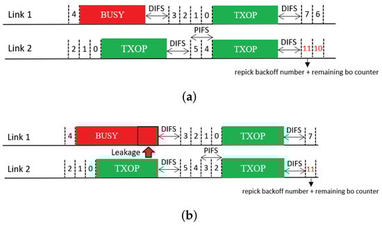 Compensation after repicking a backoff count (Repick + Comp). (a) STR MLD, (b) Non-STR MLD.