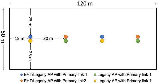 - Indoor random deployment: Following the 3rd Generation Partnership Project (3GPP)’s indoor evaluation scenario for coexistence in unlicensed spectrum [22], the APs are evenly placed, and devices with link adaptation are randomly distributed to allow the coexistence performance to be investigated under more realistic conditions. The deployment area considered in this scenario and the placement of the APs are shown in Figure 16.