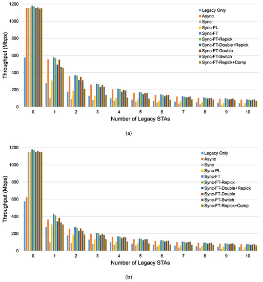 Figure 18b shows the throughput performance without the STR capability. The extent to which Sync-FT suffers from power leakage is limited, and it becomes the best scheme. The variants of Sync-FT show similar performance trends as in the case with the STR capability. Async suffers from power leakage and achieves limited throughput, especially in the case of an EHT system alone. This means that Async fails to fully exploit the benefits of MLO with power leakage. As the number of legacy STAs increases, the performance gap between Async and Sync-FT decreases, showing that its throughput is predominantly limited by contention in this case. As in the case without power leakage, Sync and Sync-PL still suffer in the presence of legacy STAs.
