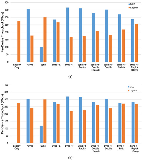 Figure 21 shows the per-device throughput performance for an increasing number of total devices in the network. The performance trends are similar between the cases with and without the STR capability. Sync-PL achieves almost the same performance as the legacy-only case. Sync shows poorer performance than the legacy-only case, and its performance degradation increases as the number of devices increases. The other MLO schemes achieve better performance than the legacy-only case. The throughput performance of the legacy devices is exactly the same as for the legacy-only case when the legacy devices are coexisting with MLDs under Sync-PL but worsens with the other schemes. Moreover, the degradation for the legacy devices increases as the number of devices increases. Among the various schemes, Sync-FT-Repick + Comp is shown to achieve the best coexistence performance, although it offers poorer coexistence for a higher number of devices since the contention between MLDs is already high and the legacy devices receive fewer channel access opportunities.