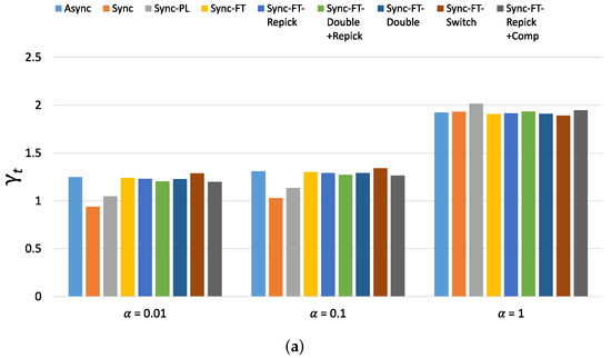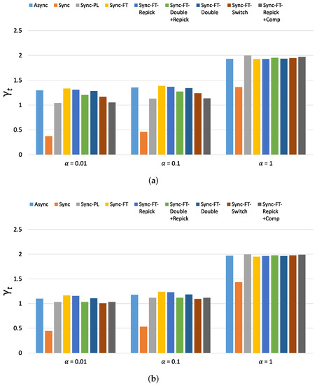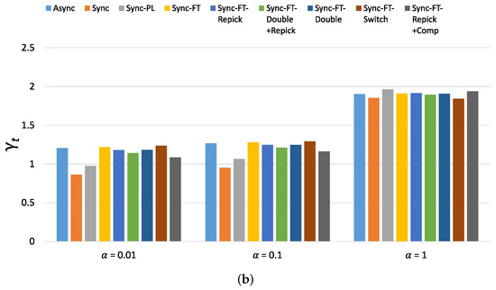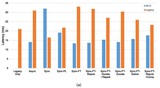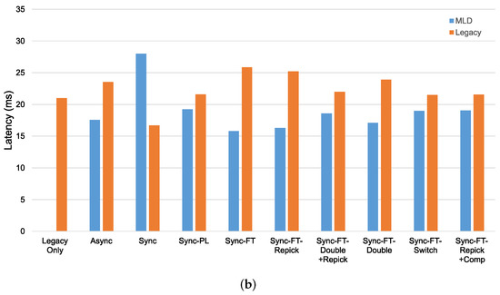 In the case with the STR capability, as shown in Figure 19a, we can see that most schemes except Sync, Sync-PL, and Sync-FT-Repick + Comp show significantly lower throughput of the legacy devices, implying that their throughput gains result from the decreased channel occupation time of the legacy devices. Sync shows significant performance degradation of the MLDs, while Sync-PL achieves a throughput similar to that with legacy devices only, as also shown in Figure 18. It is seen that Sync-FT performs aggressive operations, and its variants somewhat mitigate such aggressiveness. Among the variants, Sync-FT-Repick + Comp shows the throughput of the legacy devices that is closest to that in the legacy-only case, but its throughput gain is simultaneously reduced. Figure 19b shows the performance results without the STR capability. Most schemes result in a lower throughput of the MLDs than in the case with the STR capability, and thus, the legacy devices achieve more throughput, leading to smaller throughput gaps between the MLDs and legacy devices. The corresponding latency results are presented in Figure 20, showing that MLO is also beneficial in terms of latency. The observed coexistence performance trends in terms of latency are similar to the throughput trends described above.