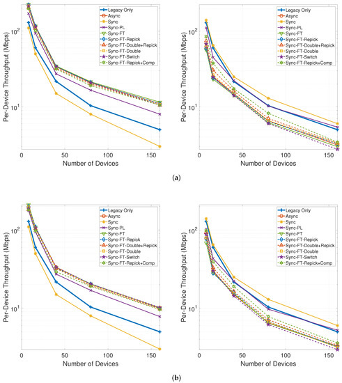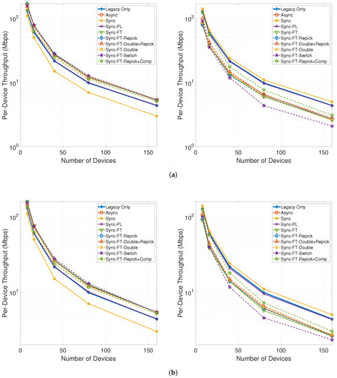 Figure 23 shows the per-device throughput performance for an increasing number of total devices. The overall trends are similar to those observed in the single-spot deployment scenario. Sync-FT and its coexistence solutions achieve better performance than the legacy-only case. Sync-PL shows almost the same throughput performance as that achieved with legacy devices only. As the number of devices increases, the throughput gain of Sync-FT also increases. In contrast, the performance degradation of the legacy devices is more severe than in the single-spot deployment scenario. Sync-FT-Repick+Comp still shows the best coexistence performance among the proposed solutions. Similar trends of are also observed in Figure 24.