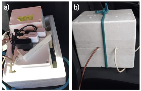 Devices under test placed in the exposure box: (a) inside the box, we placed 5 of our units with a power cord for each of them. (b) The box was closed, and the air was pumped inside the box via a 6 L/min pump to ensure a constant air flow. The air was taken from the same pipe used by the reference monitoring station.