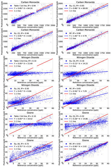 For the proposed models, we obtained comparable and even better coefficients of determination for all three candidate gases with slopes very close to 1 and intercepts between 10 and 100. With respect to the DQO imposed by the EU, we concluded that all sensors can meet the estimation level (class 3) on intervals that can be found outdoors in real environments, and some models can reach the indicative level (class 2). The indicative level was only obtained for CO on all models evaluated and for O3 when the RF models were used; whereas, for NO2, it was only obtained when the RF models were used and for high concentrations of the parameter.