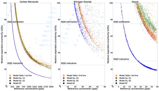 Based on Equation (7), the relative expanded uncertainty was computed for all three candidate sensors taking into account the reference uncertainty. Figure 4 presents the plot of Ur against the reference measured during the validation phase of all the models considered. We report the uncertainty with a coverage factor of 2, meaning that the level of confidence in the reported values was 95%. It is important to note that values below the DQO indicative level can be used as supplementary pollution information to reference measurements. Thus, devices that report values within this level of uncertainty have a high confidence in measuring the correct concentration of pollutants. Moreover, Figure 4 shows that the nonparametric RF models performed better, and the devices under test can reach the DQO indicative class for small ppb values of measured gases. The NO2 gas was the only candidate that only reached the DQO estimation class and not the indicative class. However, as uncertainty decreases with increasing measured gas concentration, we can infer that, for values greater than 100 ppb, our devices are able to reach the indicative class for this parameter as well. Such values are not uncommon in the peak traffic hours of many large and medium cities.