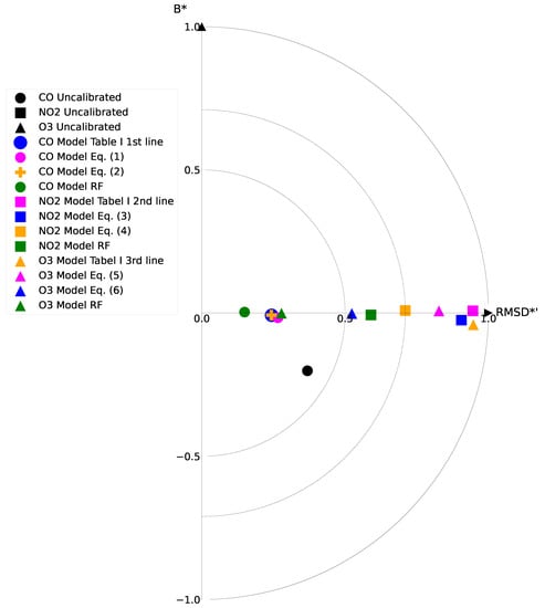Figure 5 presents the target diagram for all candidates. This summary diagram highlights the relationship between the root mean square difference (RMSD) and the bias (B) for both the reference and the proposed model [28]. The distance between each point and the origin represents the total RMSD between the model and the reference. The diagram also shows whether the standard deviation of the model is larger (X > 0) or smaller (X < 0) than the reference. Figure 5 uses the bias and the RMSD normalised by the standard deviation of the reference. The CO sensor scenarios and the RF model for O3 yielded good results with points inside the circle radius of 0.5, whereas the NO2 and the other O3 models had slightly lower results since they were plotted in the circle radius of 0.7. The target diagram only included the cases having an RMSD smaller than one. It is worth noting that, without a calibration model, all sensor data except that of the CO sensor are unreliable.