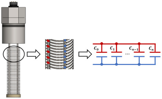The authors proposed in [29] a capacitive sensor based on paralleled disk, as presented in Figure 2. As the sensor is immersed into the emulsion, the fluid act as the dielectric of an array of capacitors. The importance of having an array of paralleled capacitors is that higher values of capacitance increase the precision of the measurements, as the parasitic elements (from the cables, circuit boards, etc.) have less influence on the process. In addition, the proposed circuit uses a Howland current source topology, with enhancements that allow its continuous oscillating operation and easy adjustment of output current and frequency.